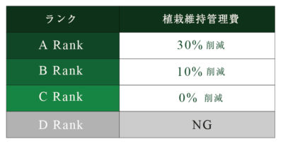 「空間ランクづけ」サービスは、このエビデンスをもとに提供するもので、植物に欠かせない4つの項目(室温・湿度・風速・光)を専門スタッフが測定し、それぞれの項目を植物の生育状態へ与える影響について4段階のレベルに分けてポイントを付与する。その4項目の合計ポイントに応じて、植物の生育に最適な「A」から枯れる可能性の高い「D」まで空間を4つのランクに分類。ランク付けに応じて植栽維持管理費が、Aランクは-30%、Bランクは-10%と月々の費用が削減される。Cランクは通常の料金(0%)とし、Dは生育困難に設定した。これにより、いままでは一定であった「植栽の枯れ保証費」を、枯れるリスクをあらかじめ把握することで、ユーザーの環境に合わせた適切な「枯れ保証費」を設定できることが可能になった。