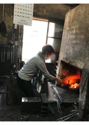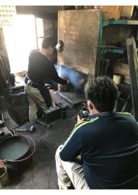 取材中、火起こしの様子を撮影させていただいていると「入ってみますか?」とお声がけいただいたので、火床近くに入らせていただきました。ほんの2、3分程度、火床の前に立ち、真似事をしただけでしたが、コークスから立ち上がる炎は刺すように熱く、仕事の大変さを実感しました。しかし、鋼を操る鍛治の魅力を感じたのもまた事実です。容易くないからこそ放つ輝きと重みがそこにはありました。
