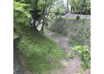 龍城堀の石垣(左)と清海堀の土塁と石垣(右)